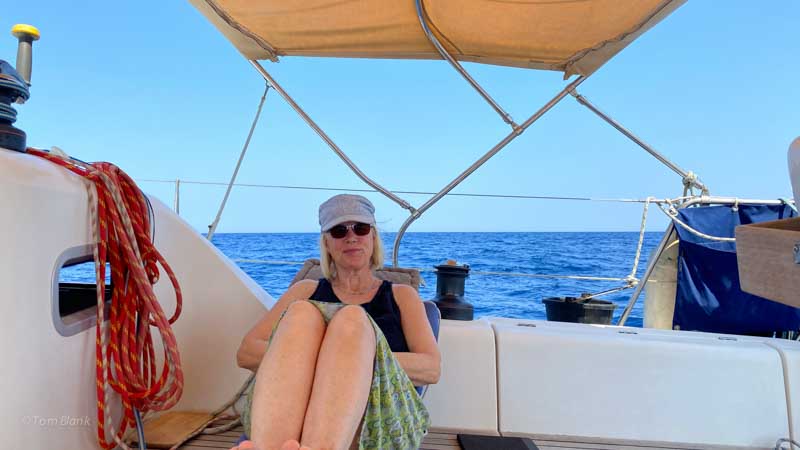 Die Reise zum Chalkidiki ist 42 Seemeilen lang und geht nach Norden. Wir haben Glück, am Sonntag weht statt des üblichen Nordwinds ein moderater Ostwind mit wenig Welle. Punkt 8 Uhr liften wir den Anker und fahren los. Eine gute Stunde später schon haben wir den Wind zu fassen und können die Maschine bis kurz vor dem Ziel aus lassen.