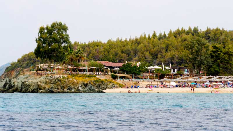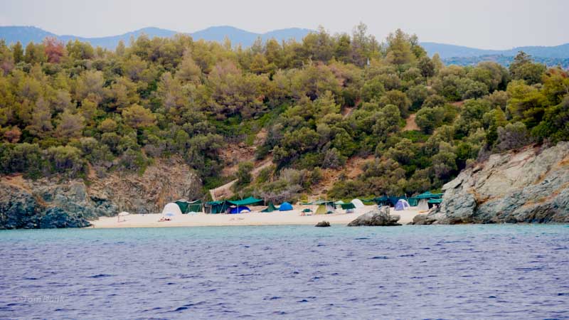 Von den drei Fingern der Chalkidiki soll der westlichste, genannt Kassandra, sehr touristisch sein. Den wollen wir nicht bereisen. Laute Discomusik bis in die frühen Morgenstunden brauchen wir nicht. Wir segeln die Westküste von Sithonia, den Mittleren Finger hinauf. Die Küste ist gut bewaldet bis hinunter an die Ufer. Viele schöne Strände sehen wir ohne motzige Hotels.