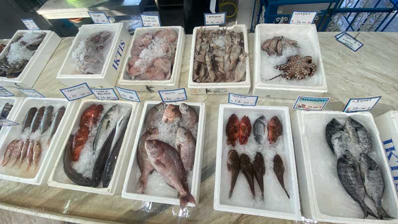 Der schöne Fisch, dessen Namen wir nicht auf Deutsch wissen, gehört nicht zum Tiefkühl Sortiment. Ihn haben wir aus dem reichhaltigen Angebot des Fischhändlers von Koufos „geangelt“.