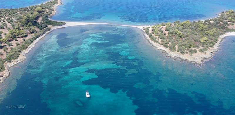 Unser Ziel ist die Insel Papadia, die aber tatsächlich über eine flache Stelle mit dem Festland verbunden ist.