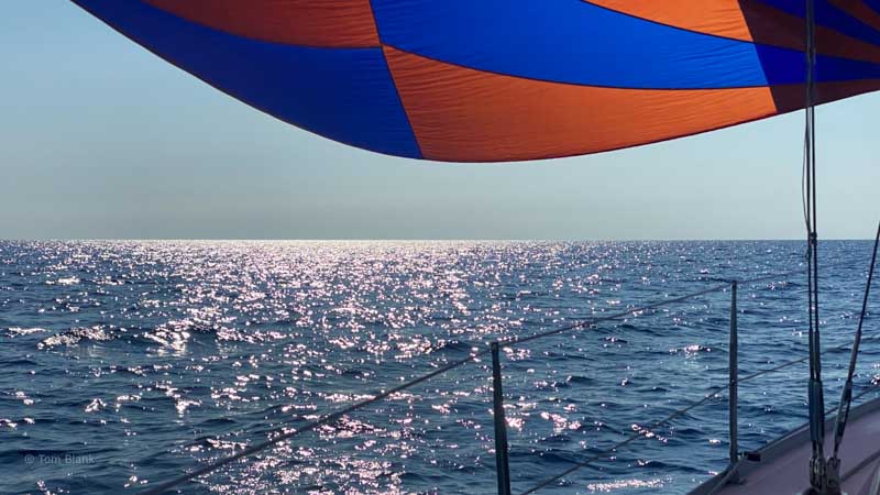 Am zweiten Tag ist weniger Wind und wir können unseren Gennacker benutzen. Jetzt ziehen uns 100 Quadratmeter zusätzlich durch die Wellen. Die machen aber aus 7 Knoten Wind immerhin 4,5 Knoten Fahrt. Aber wir haben ja Zeit.