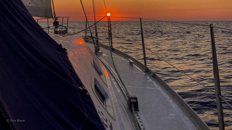Mit dem Aufgehen der Sonne kehren auch bei uns die Lebensgeister zurück. Der Tag läuft perfekt ab mit wenig aber ausreichend Wind und kaum Wellen. Wir haben uns eingespielt – aufeinander und auch auf das Schiff, welches tapfer seine Bahnen zieht.