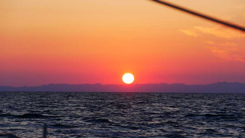 Dem zweiten Sonnenuntergang sehen wir bereits sehr viel gelassener entgegen. Auch weil in etwa 35 Seemeilen Entfernung Sardinien bereits gut zu sehen ist.